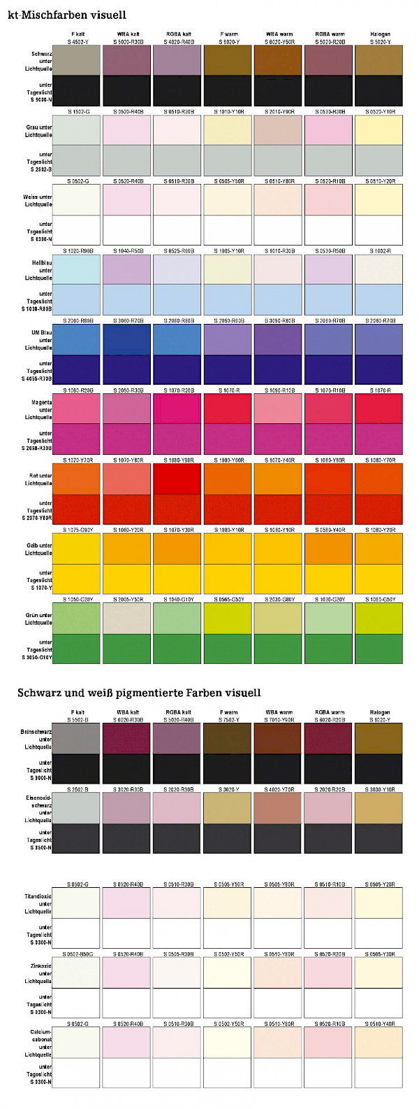 Die nachfolgene Übersicht visualisiert typische Farbveränderungen bei unterschiedlichem Kunstlicht mit Leuchtstofflampen und LEDs. Die jeweils zweite Reihe zeigt die mit Tageslicht beleuchtete Fläche mit dem dazugehörigen Code des NCS-Farbsystems, darüber die identische Farbvorlage, beleuchtet mit Leuchtstofflampen oder LED-Licht. Ich danke Prof. Ulrich Bachmann für die Genehmigung zur Veröffentlichung. Die Abbildung steht als gedruckte Version im Titel »LED Colour Lab« zur Verfügung.