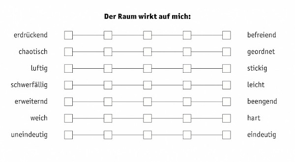 Das Semantische Differential ist ein Fragebogen zum Ankreuzen. Dabei stehen sich Begriffspaare gegenüber, jeweils verbunden durch einer Skala von -2 bis Null und von Null bis +2. Die 25 Begriffspaare repräsentieren subjektive emotionale Wertungen zur Wirkung eines Raums auf eine konkrete Person. Die Aussagekraft entsteht durch eine grafische Auswertung, bei der 10 bis 20 Fragebögen statistisch ausgewertet werden. Der daraus ablesbare Ist-Zustand kann (nach einer Umgestaltung) auf die gleiche Weise wiederholt werden, wodurch sich die erreichten Verbesserungen gut überprüfen lassen.