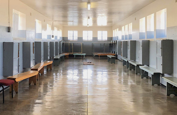 Am Beispiel des Umkleideraums im Gefängnis von Robben Island (Südafrika) ist deutlich ablesbar, daß er rein funktional konzipiert ist. Die Materialien und Oberflächen sind robust und widerstandsfähig, sie wirken banal, abweisend, hart und distanzierend. Sie haben offensichtlich die Funktion, den Gefangenen nur ein Minimum an Bequemlichkeit und Aufenthaltsqualität zu liefern.